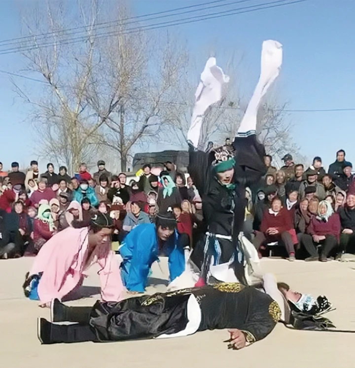宋建亮(上)表演地秧歌與武術(shù)相結(jié)合的動作疊羅漢。