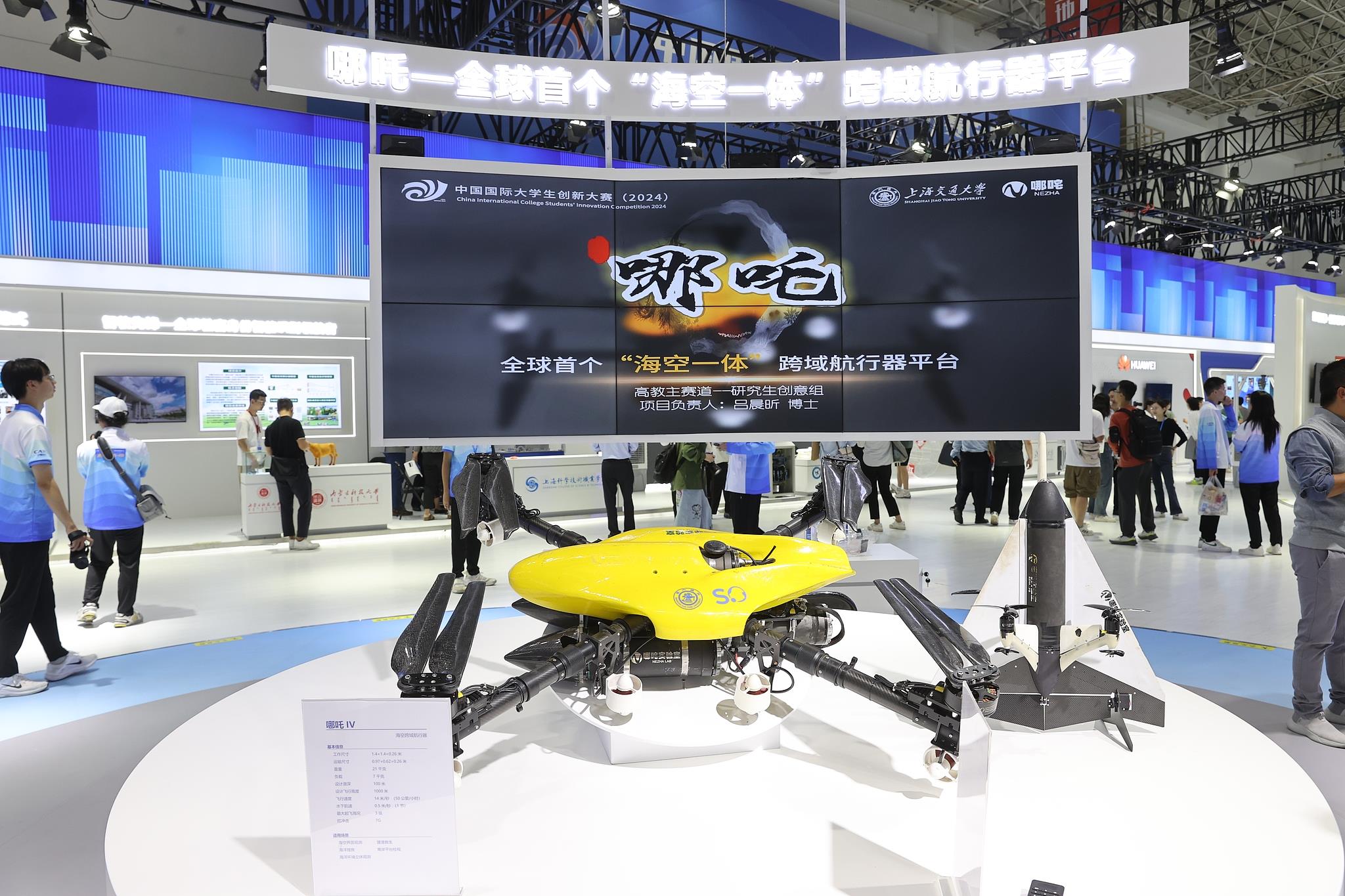 △2024年10月12日至15日,中國(guó)國(guó)際大學(xué)生創(chuàng)新大賽總決賽及同期活動(dòng)在上海舉行。來(lái)自上海交通大學(xué)的“哪吒——全球首個(gè)‘??找惑w’跨域航行器平臺(tái)”項(xiàng)目奪得冠軍。
