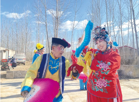 “改良方面,我們借鑒了京劇和其他劇種中的丑角動作和音樂節(jié)奏,將這些元素融入到‘倫派地秧歌’中?!闭f罷,杜慶志做了一個京劇中小生的亮相?!昂芏嗳苏J為秧歌就是快節(jié)奏,其實不是。節(jié)奏快慢有變化,演出才能有層次,觀眾感官上也不容易疲憊,這樣才能做到‘滿堂是戲’?!倍艖c志說,除了動作和節(jié)奏,劇目方面,“倫派地秧歌”推出了《快樂的煙袋》《不忘初心》等新作品,這些作品既保留了傳統(tǒng)秧歌的韻味,又融入了現代元素,“這些創(chuàng)新不僅豐富了‘倫派地秧歌’的表演形式和內容,也為其注入了新的活力和生命力?!?/p>