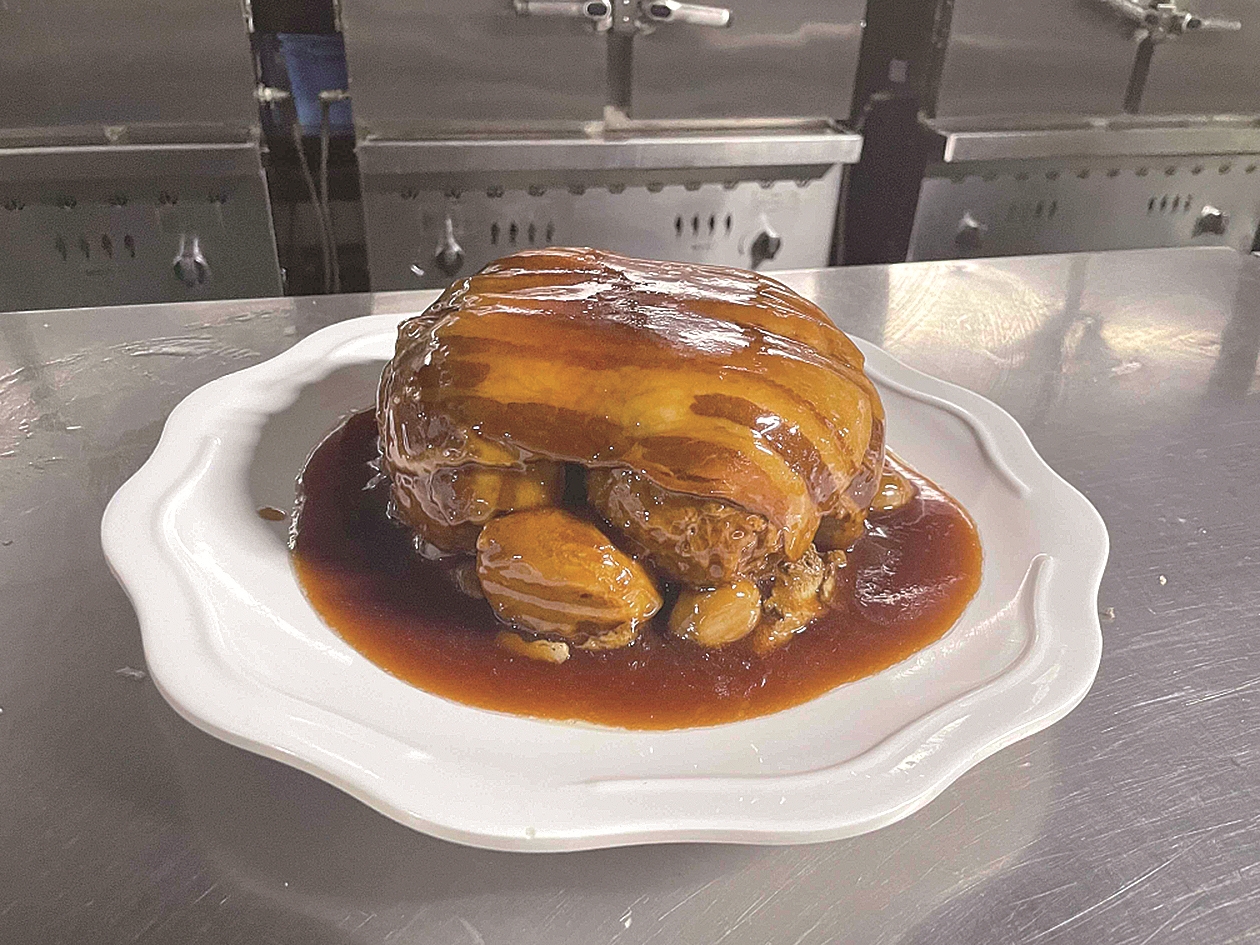 碼好的砂鍋放至蒸箱,經(jīng)過4個小時的慢蒸,各色食材在蒸汽氤氳中交融。蒸好后,將砂鍋倒扣在白色瓷盤中。那一瞬間,整道菜赫然而出:紅潤的肉片泛著油亮的光澤,圓潤的丸子表皮裂開滲出濃香肉汁,嫩黃的鵪鶉蛋與金黃的炸雞蛋相映成趣。最后淋上滾燙的秘制醬汁,焦糖色的濃汁順著食材溝壑蜿蜒流淌,在盤底聚成誘人的琥珀湖泊,這道福壽壇子肉一下子便成為宴席上動人的風(fēng)景。