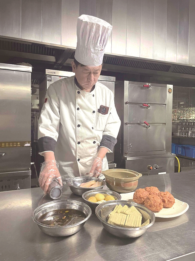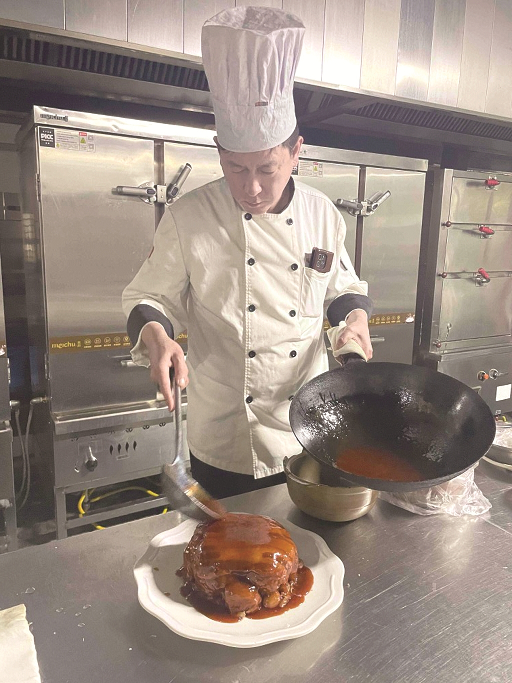 “這道福壽壇子肉的制作技藝就涵蓋了整個學(xué)廚過程:比如在分檔取料過程中要選擇好煮肉和攪餡的部位;在過油階段,要用恰當(dāng)?shù)幕鸷蛘ê猛枳雍碗u蛋;最見功夫的要數(shù)蒸菜階段,要控制好火候和時間,使做好的菜品肉質(zhì)酥爛、肥而不膩?!睆埡暾f。