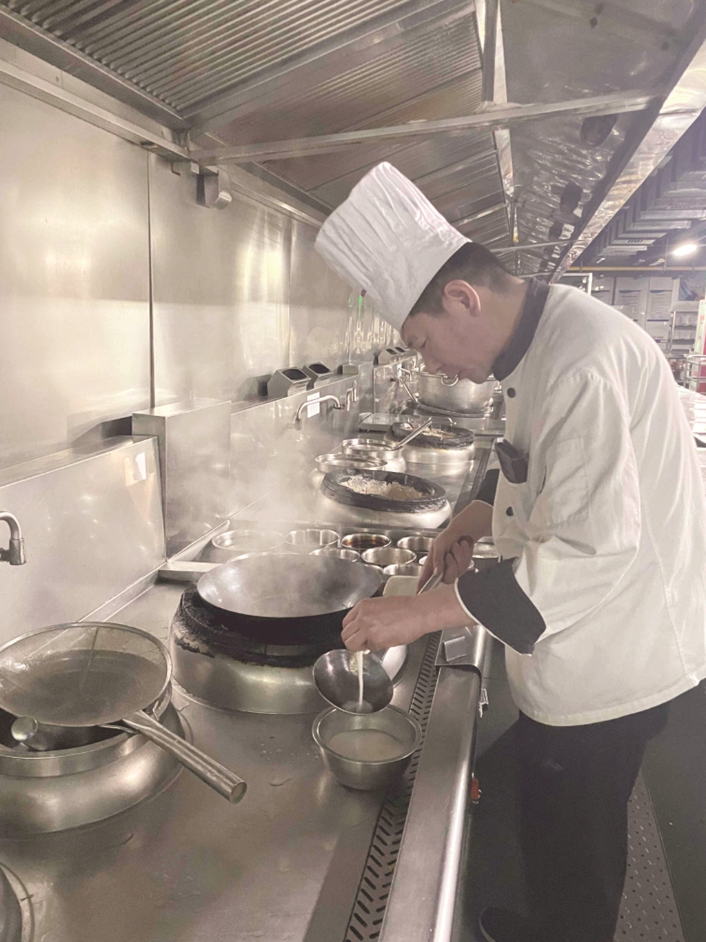 5月15日上午9點,張宏來到酒店廚房。此時,廚師班已經(jīng)開始忙碌起來,切肉、擇菜、清洗、攪餡、過油……