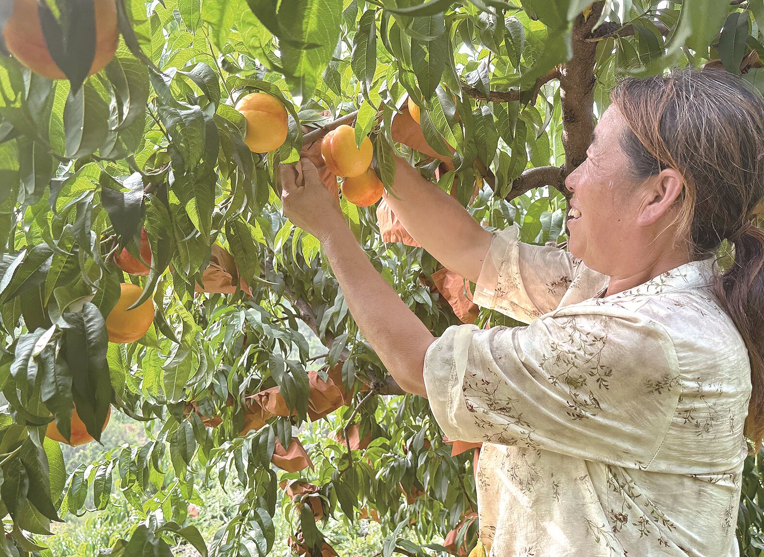 王漢溝農(nóng)戶正在采摘黃桃。 記者 陳立桐 攝