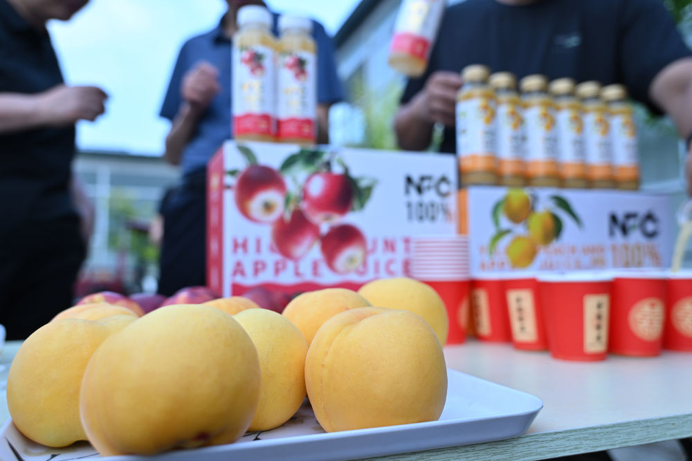 這是7月4日拍攝的河北光存生物科技有限公司種植的黃桃和NFC果汁產(chǎn)品。新華社記者 李鑫 攝
