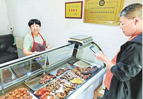 山海關(guān)區(qū)非物質(zhì)文化遺產(chǎn)代表性項(xiàng)目傳承人馬玉萍(左)在店里接待顧客。記者 劉雙喜 攝