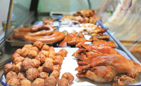 油潤(rùn)光亮的熏雞、松腴芳茹的豬頭肉、醇厚爽滑的鹵豬舌、靡軟Q彈的豬蹄、香嫩豐潤(rùn)的粉腸……不消多大工夫,柜臺(tái)里的大半熟食都跟隨面帶笑容的主人四散而去了。