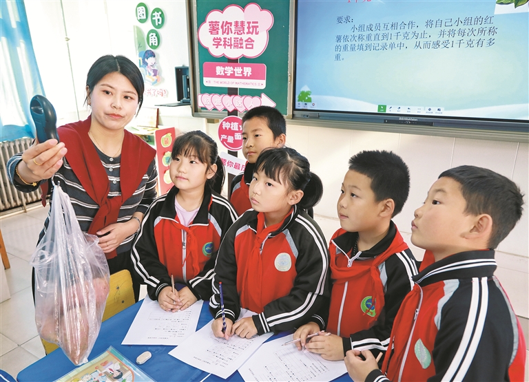 計(jì)算種植面積、統(tǒng)計(jì)產(chǎn)量、進(jìn)行成本核算……課堂上,同學(xué)們成為“紅薯經(jīng)營小達(dá)人”,運(yùn)用所學(xué)知識(shí)測(cè)量紅薯體積,并設(shè)計(jì)“紅薯義賣”價(jià)格方案,將數(shù)學(xué)知識(shí)靈活運(yùn)用到實(shí)際生活中。