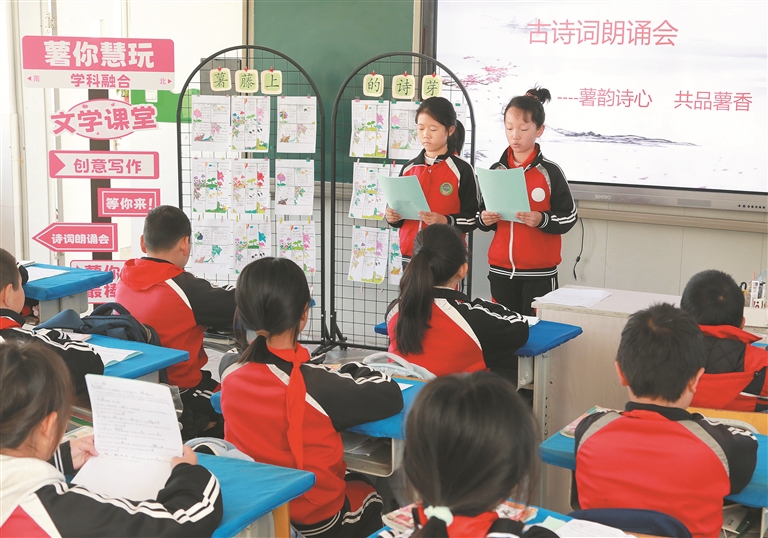 當(dāng)紅薯與語文課相遇,碰撞出文學(xué)創(chuàng)作的火花。在繆莊小學(xué)的文化長廊里,開辟了一處名為“薯藤上的詩芽”的詩歌作品展示區(qū),上面貼滿了同學(xué)們的創(chuàng)意寫作作品;“薯韻詩心”寫作課上,同學(xué)們用生花妙筆描繪出與紅薯相關(guān)的奇妙故事;“不似百芳春絢爛,只和藤葉共云霞。寒來愿向爐中烤,一捧丹心到汝家?!痹娫~朗誦會(huì)上,大家飽含深情地誦讀關(guān)于紅薯的詩詞,感受傳統(tǒng)文化的魅力。