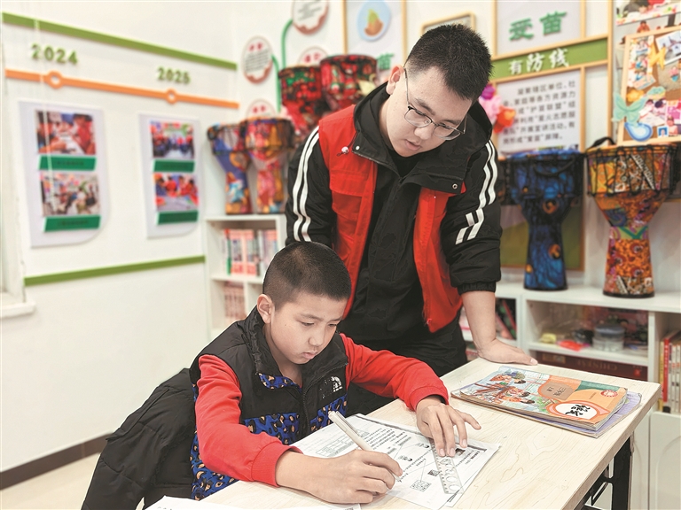 在“小候鳥(niǎo)驛站”,志愿者給小學(xué)生輔導(dǎo)功課。通訊員 周磊 攝