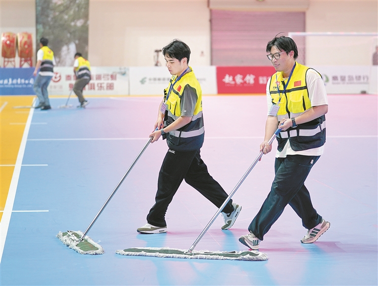 志愿者在賽前和休息時間認真擦拭地板。