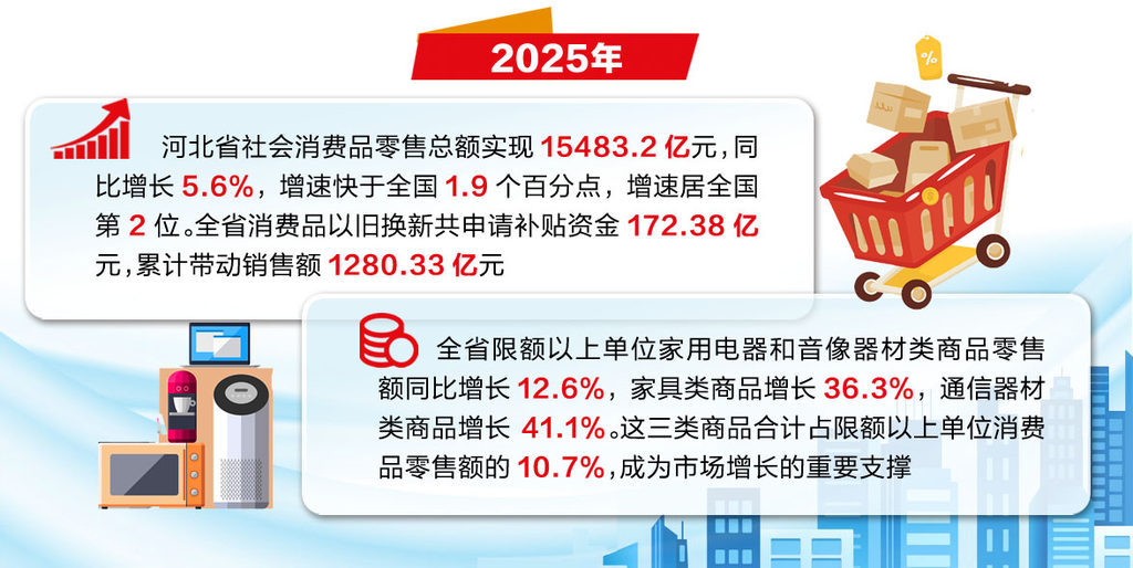 2025年,河北省社會消費(fèi)品零售總額實現(xiàn)15483.2億元,同比增長5.6%,增速快于全國1.9個百分點(diǎn),增速居全國第2位。全省消費(fèi)品以舊換新共申請補(bǔ)貼資金172.38億元,累計帶動銷售額1280.33億元。