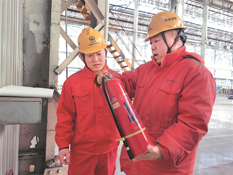 張偉(左)與同事探討滅火器使用技巧。記者 劉建楠 攝
