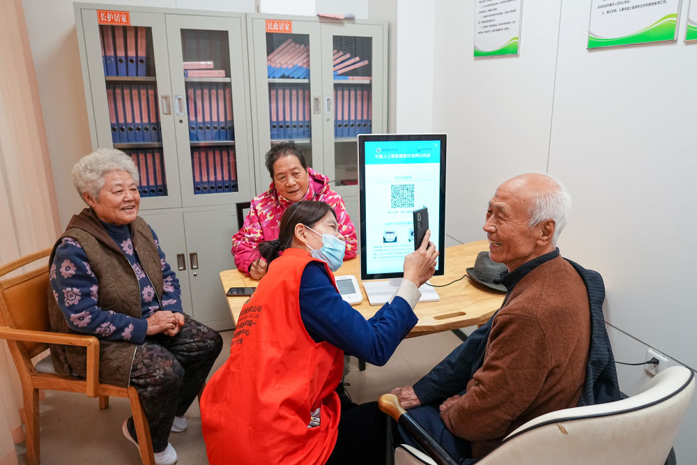 2025年10月23日,老人們在山東省淄博市張店區(qū)馬尚街道金石社區(qū)日間護理中心測量健康數(shù)據(jù)。新華社記者朱崢攝
