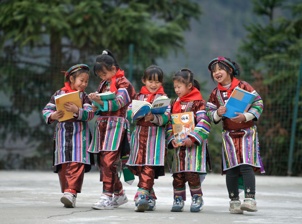 2023年2月16日,在貴州省從江縣西山鎮(zhèn)中寨教學點,領(lǐng)到新書的瑤族學生在一起交流。新華社記者楊文斌攝