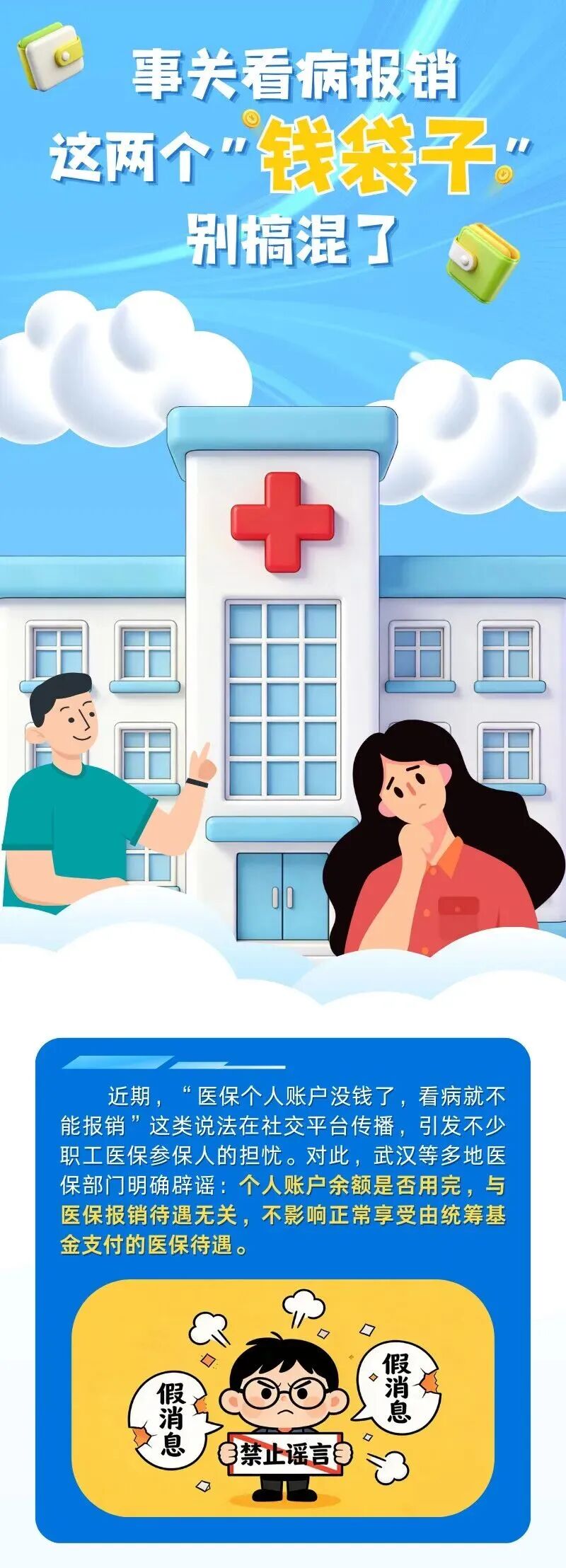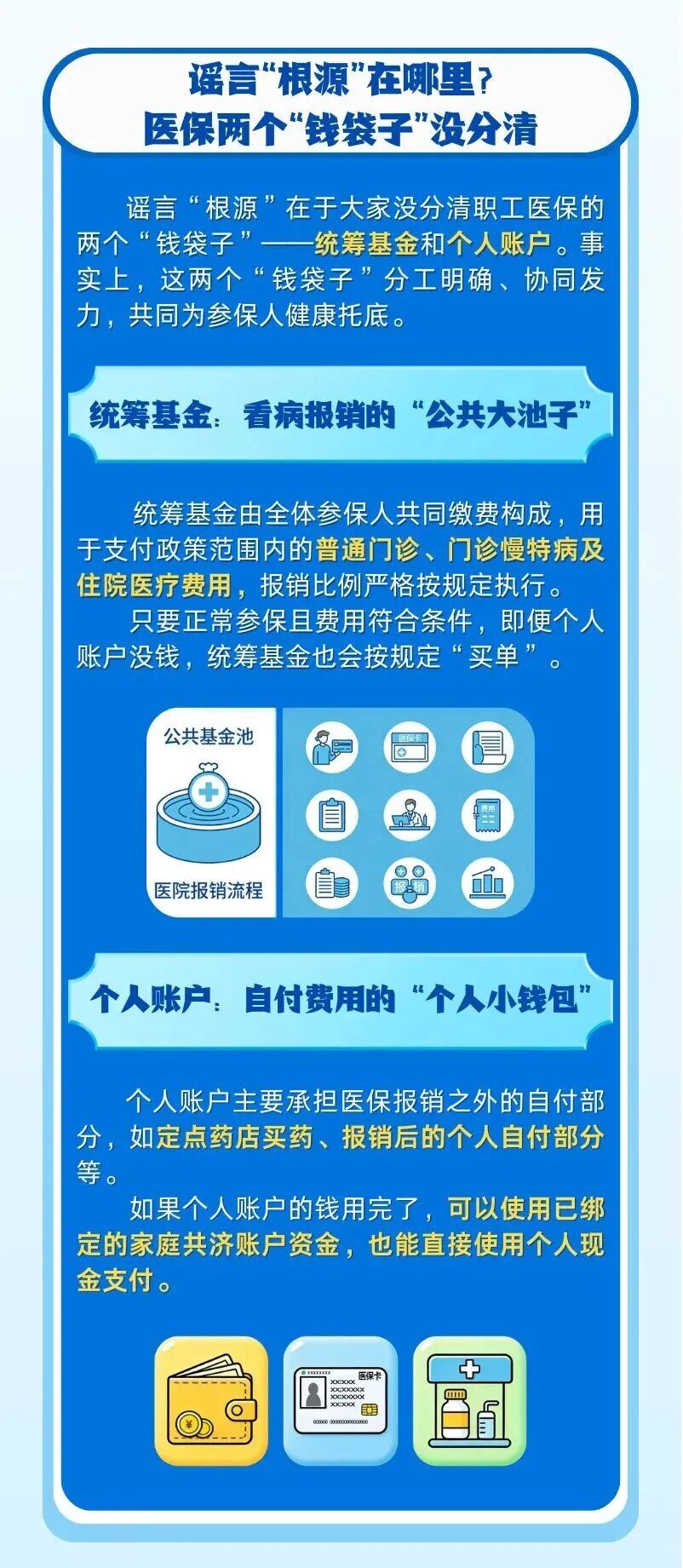 謠言“根源”在于大家沒(méi)分清職工醫(yī)保的兩個(gè)“錢袋子”——統(tǒng)籌基金和個(gè)人賬戶。事實(shí)上,這兩個(gè)“錢袋子”分工明確、協(xié)同發(fā)力,共同為參保人健康托底。