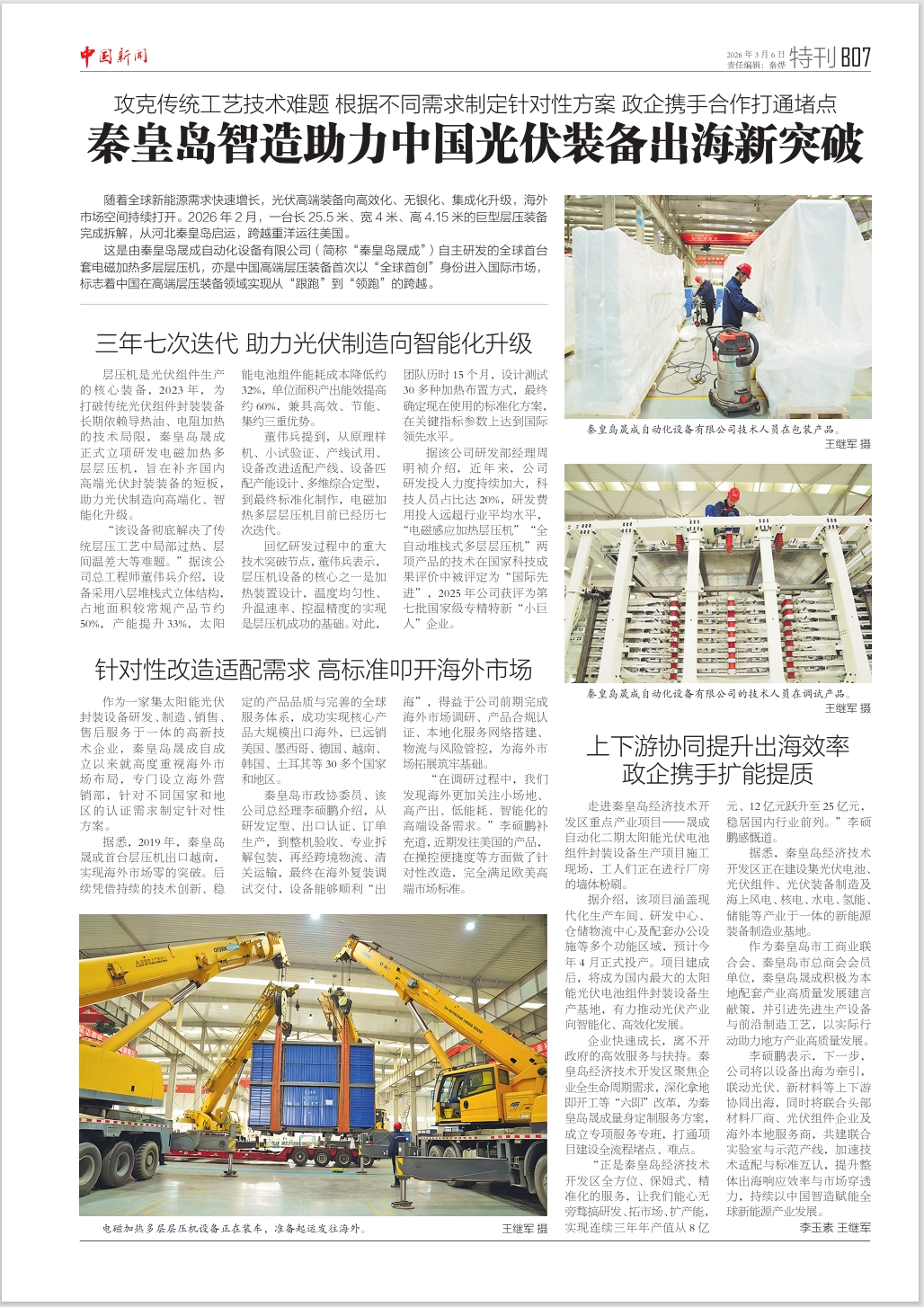 隨著全球新能源需求快速增長,光伏高端裝備向高效化、無銀化、集成化升級,海外市場空間持續(xù)打開。2026年2月,一臺長25.5米、寬4米、高4.15米的巨型層壓裝備完成拆解,從河北秦皇島啟運,跨越重洋運往美國。
