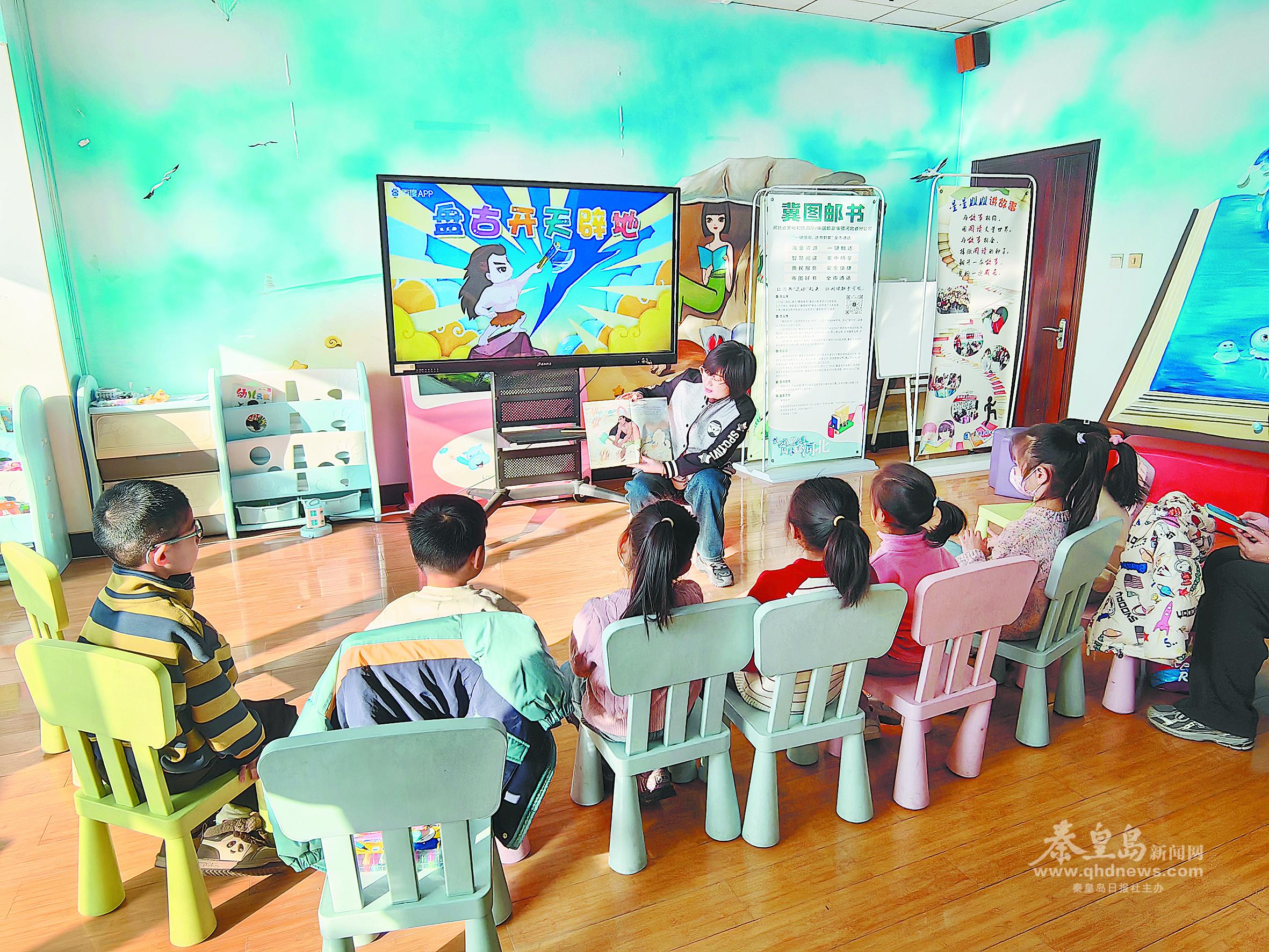 在神話故事會上,老師給小讀者講《盤古開天辟地》的故事。